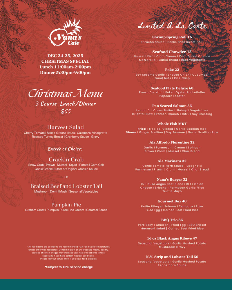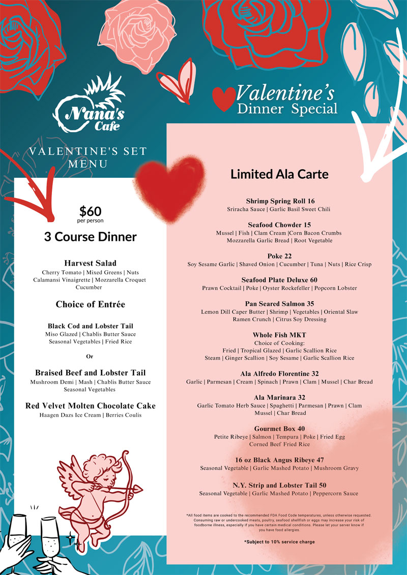 Menu items: Some menu items may be substituted due to item availability at Chefs’ discretion without notice.